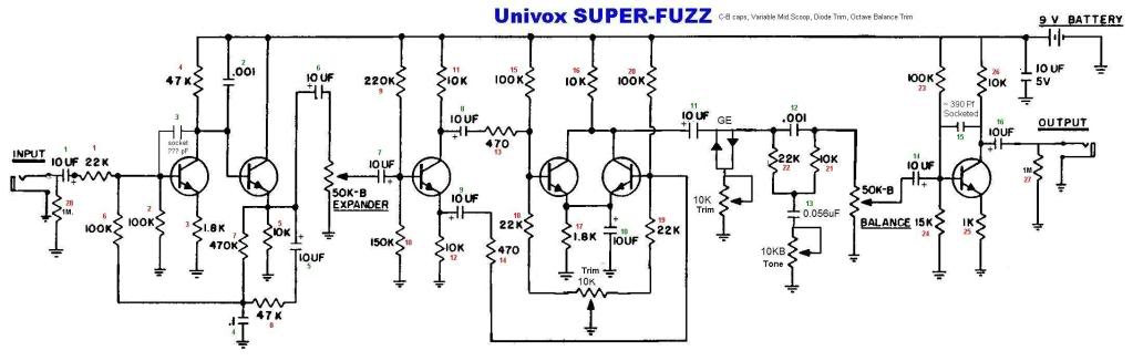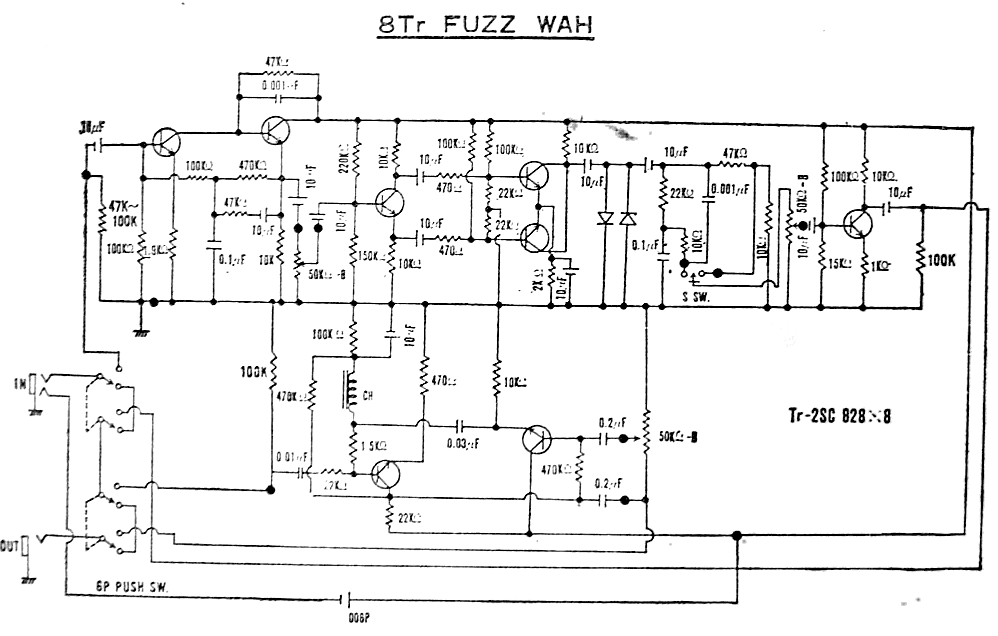 Tengo que decir que el pedal no es una copia del Shin Ei-Fuzz-Wah o el Univox Super Fuzz (que es básicamente el mismo circuito de Fuzz sin la parte Wah) sino que incorpora algunas innovaciones como la sustitución del inductor voluminoso del Wah por un circuito girador hecho con un transistor, condensadores y resistencias. Si el fuzz-wah original tiene 8 transistores, este tiene nueve. Asimismo he sustituido los caros diodos de germanio por diodos Schottky en serie con una resistencia y he utilizado un doblador de tensión para pasar de una alimentación de 9V a 18V para aumentar el rango dinámico.